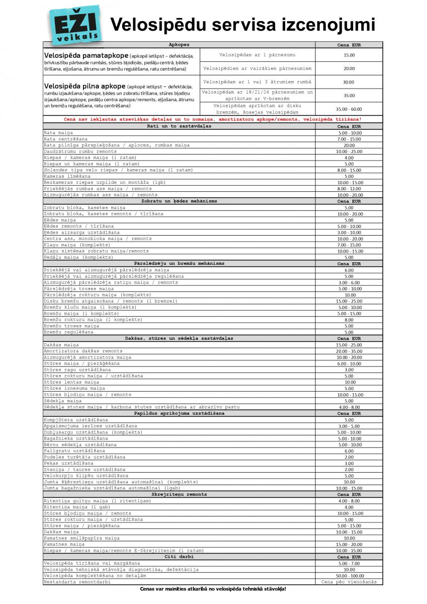 EŽU velo darbnīcā sastapsiet vīrus ar nopietnu stāžu savā arodā, kas pratīs savest kārtībā gan parasto ātrumnieku, gan jaudīgo 29nieku, gan kosmisko šosejnieku, gan arī veco padomju sieviešnieku. Neatsakām arī Māmiņām ar bērnu ratiņiem.